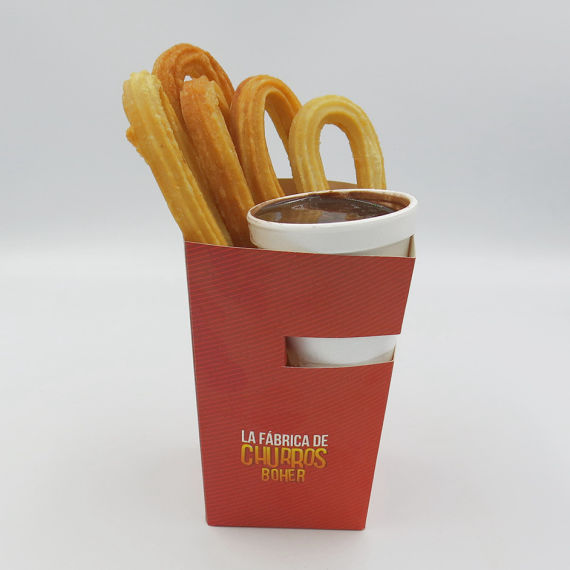 Cajita especial para churros con ranura para vaso de salsa y servilleta.
