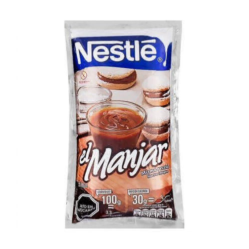 Caja de 12 bolsas de 1 kilo de manjar Nestlé, ideal para rellenar churros.